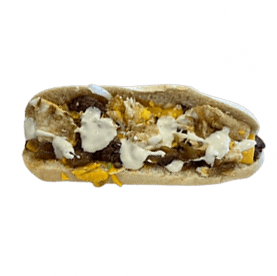 Pain long, steak, kefta, cheddar, oeuf, oignons caramélisés, sauce maison. 1 Euro de plus pour un supplément frites.