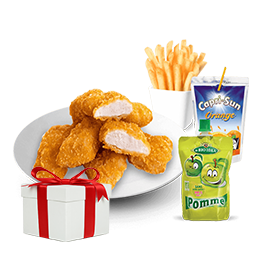 5 Nuggets + Sauce au choix + Frites + Compote + Capri-Sun + Jouet surprise.