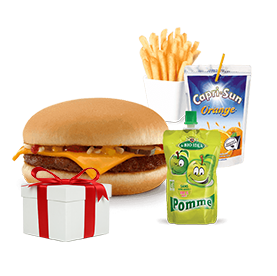 Simple burger + Sauce au choix + Frites + Compote + Capri-Sun + Jouet surprise.