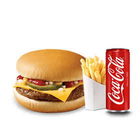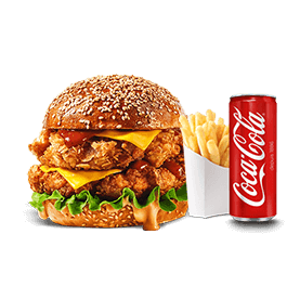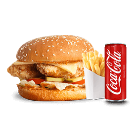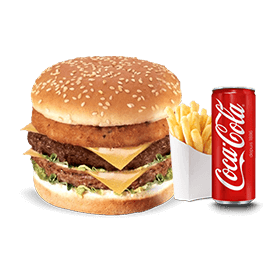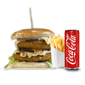 2 Steaks, 1 chicken, 3 cheddars, 1 oeuf, oignons caramélisés, sauce maison + Frites + 1 Boisson 33cl au choix.