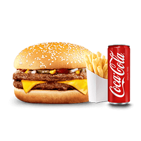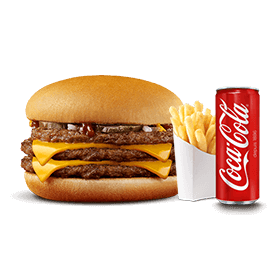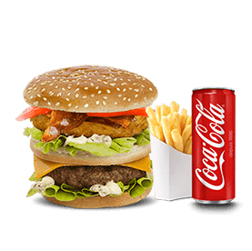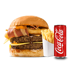 2 Steaks, 2 bacon, 2 cheddar, 3 oignons rings + Frites + 1 Boisson 33cl au choix.