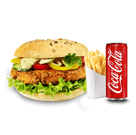 1 Steak végétarien, 1 galette de pommes de terre, crudités, sauce au choix. + Frites + 1 Boisson 33cl au choix.