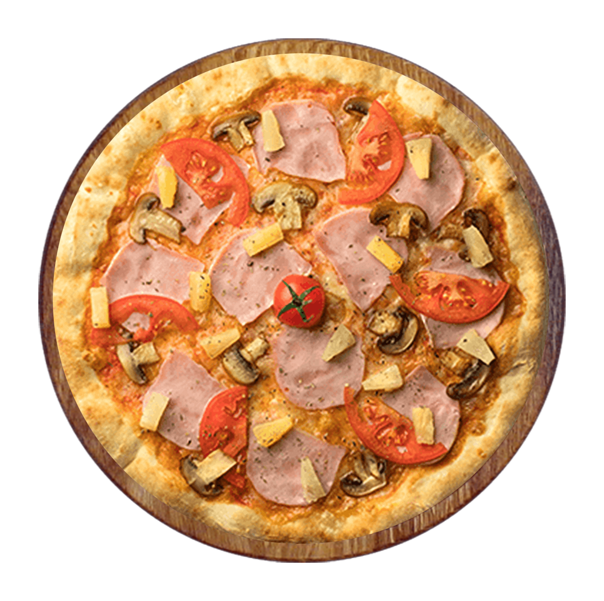 Sauce tomate, crème fraîche, mozzarella, jambon de dinde, pommes de terre, poulet, champignons, oignons.