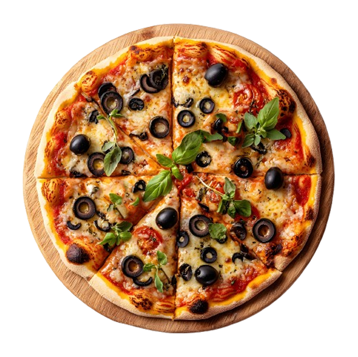 Sauce tomate, mozzarella, olives.