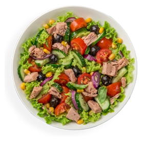 Salade, tomates, maïs, carotte, olives, oeuf, concombre, vinaigrette, thon.