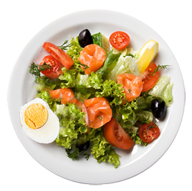 Salade, tomates, maïs, carotte, olives, oeuf, concombre, vinaigrette, saumon.