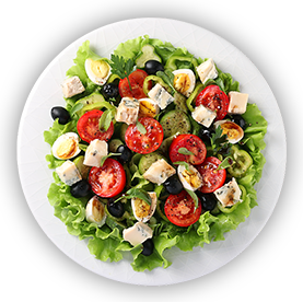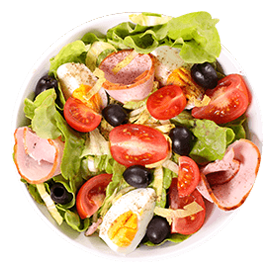 Salade, tomates, maïs, carotte, olives, oeuf, concombre, vinaigrette, jambon de dinde.