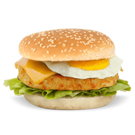 Pain buns, galette de pommes de terre, oeuf, fromage, crudités, oignons caramélisés, cornichons.