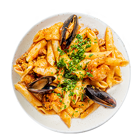 Sauce tomate, cocktail de fruits de mer, fromage gratiné. + Pain maison offert.