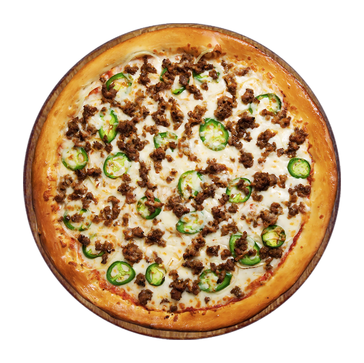Tomate, fromage, poivrons, chorizo*, champignons, boeuf haché.