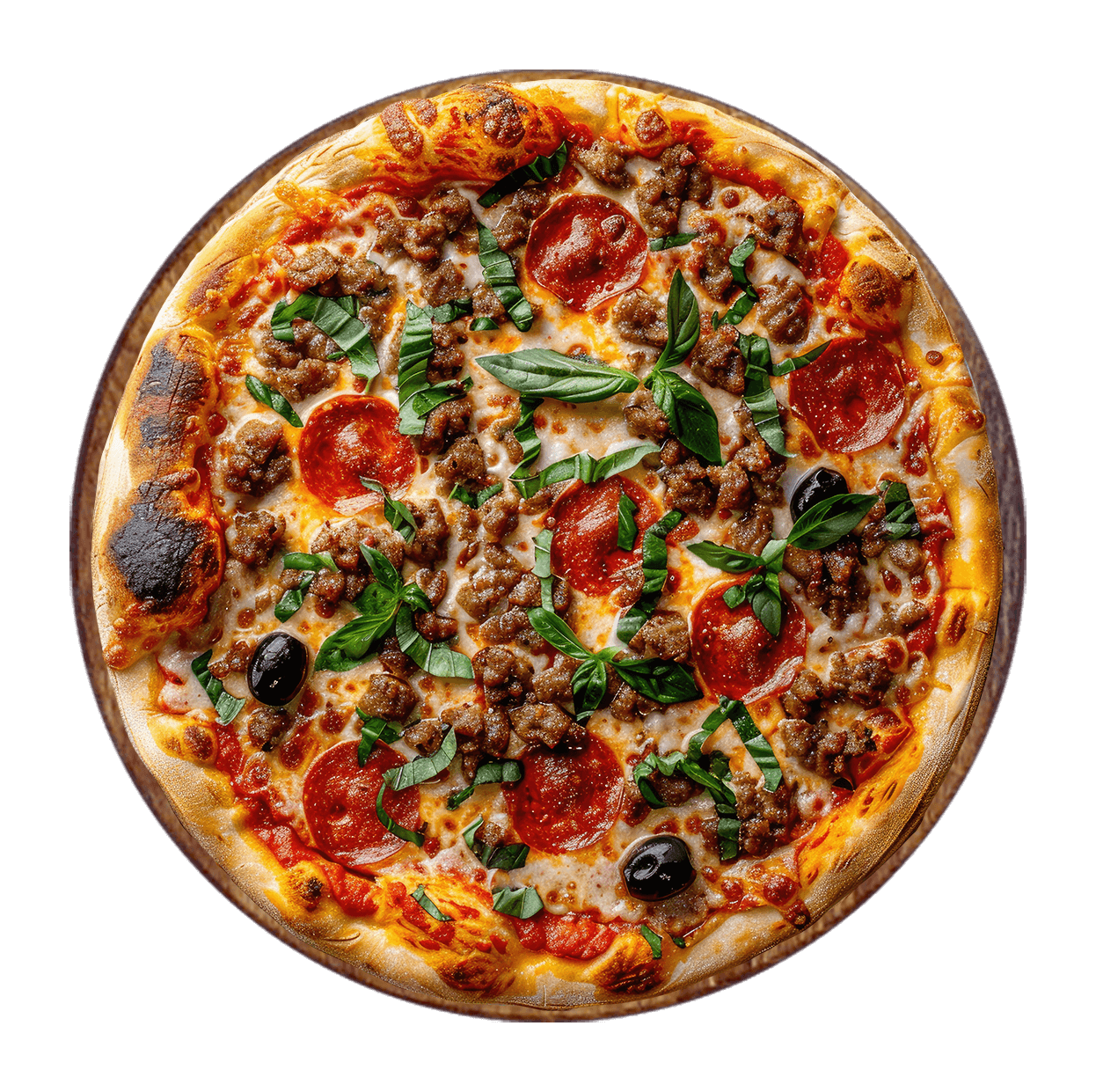 Tomate, fromage, boeuf haché, olives, poivrons, champignons.