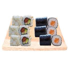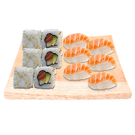 2 Sushi saumon, 2 sushi thon, 6 maki primeurs saumon avocat + Wasabi, gingembre + 1 Entrée au choix + 1 Boisson 33cl au choix.