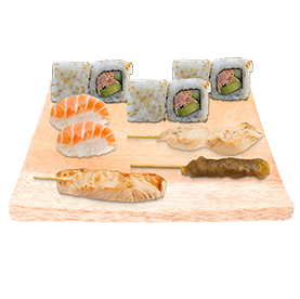 2 Sushi saumon, 6 california thon cuit avocat, 1 Brochette boeuf, 1 brochette poulet, 1 brochette saumon + Wasabi, gingembre + 1 Entrée au choix + 1 Boisson 33cl au choix.