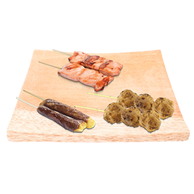 2 Brochettes saumon, 2 brochettes poulet, 2 brochettes boeuf fromage + Wasabi, gingembre + 1 Entrée au choix + 1 Boisson 33cl au choix.