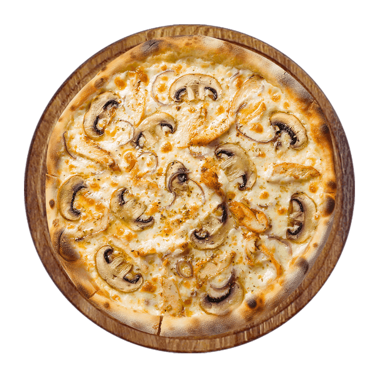 Crème fraîche, mozzarella, poulet, champignons, boursin.