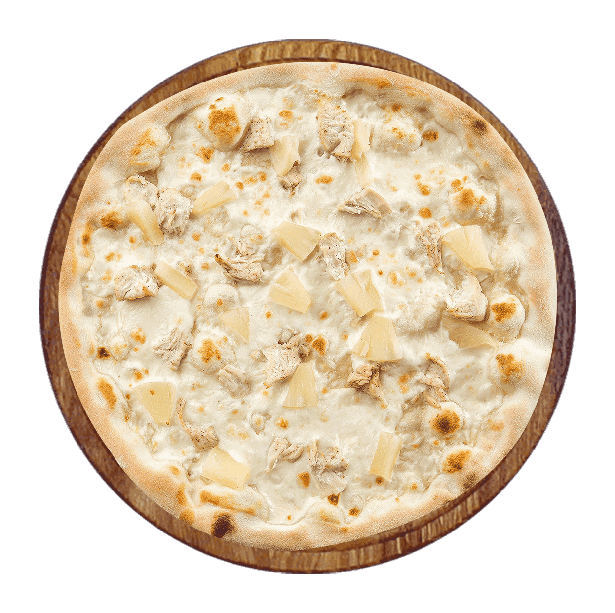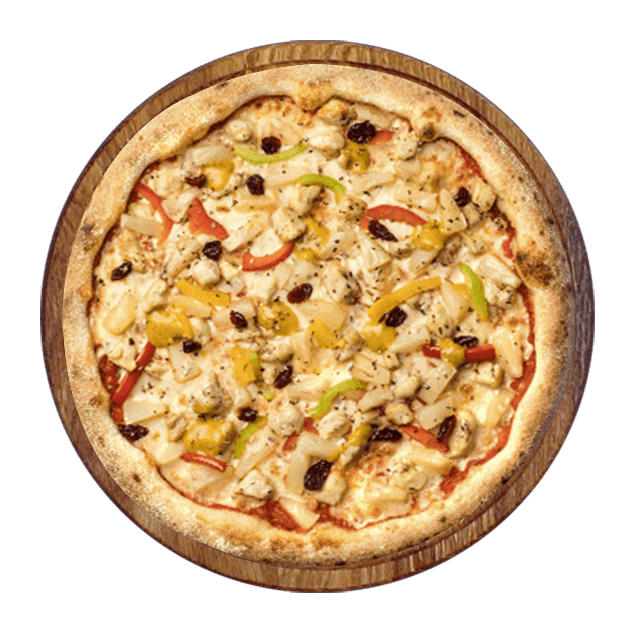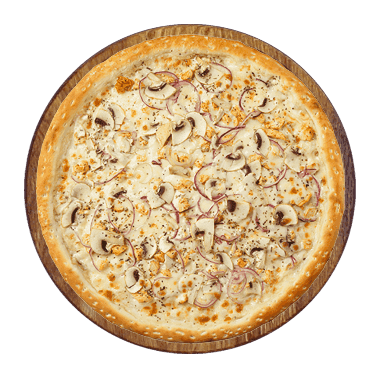 Crème fraîche, mozzarella, poulet, chèvre, champignons, poivrons.
