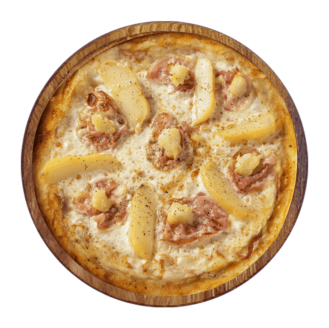 Crème fraîche, mozzarella, lardons, reblochon, pommes de terre, oignons.