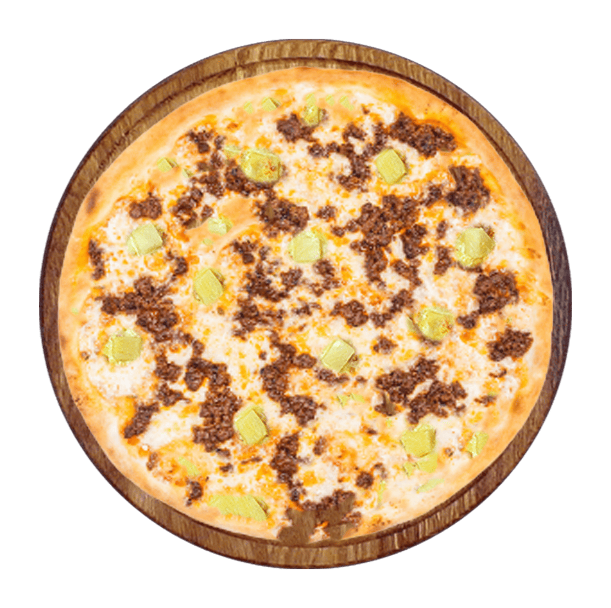 Crème fraîche, mozzarella, lardons, jambon, viande hachée, merguez.