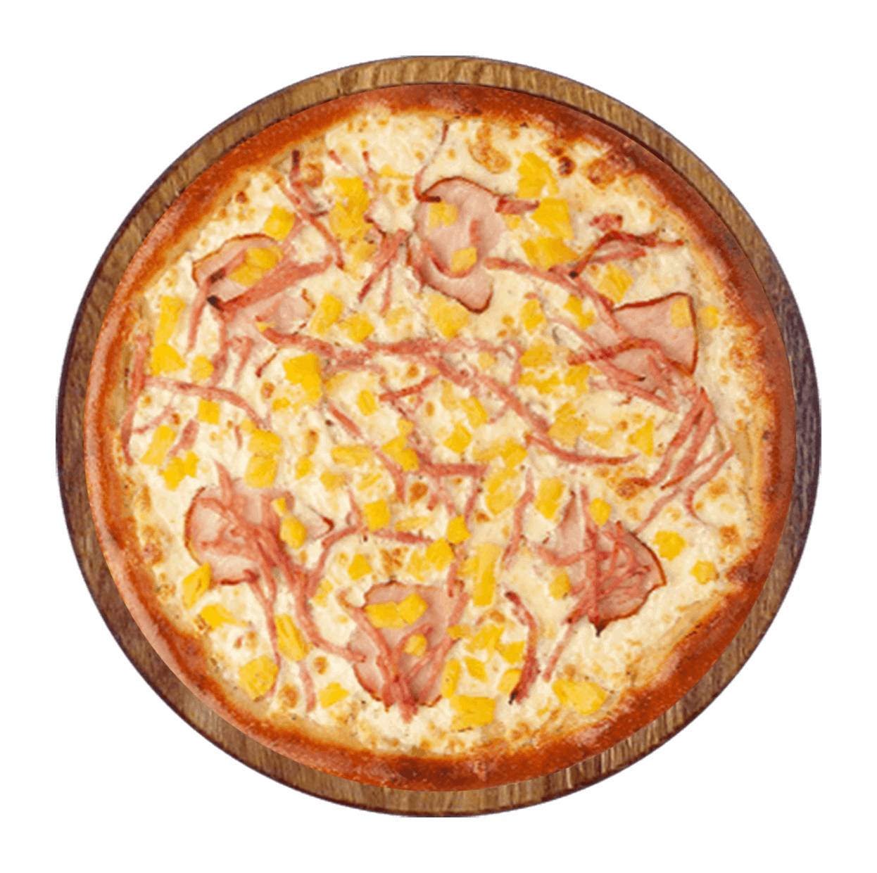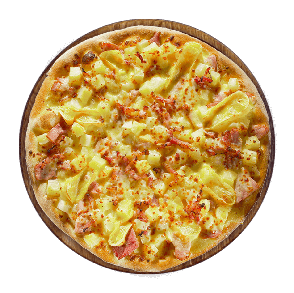 Sauce fromagère, mozzarella, escalope, poivrons, pommes de terre, olives.