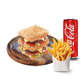 3 Pains de mie, 2 steaks, fromage, oeuf + Frites + 1 Boisson 33cl au choix..