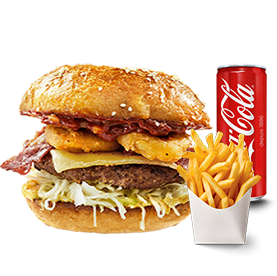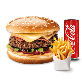 2 steaks 90gr, 2 fromages + Frites + 1 Boisson 33cl au choix.
