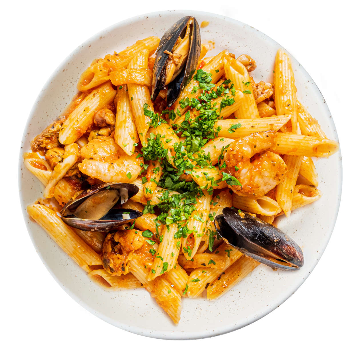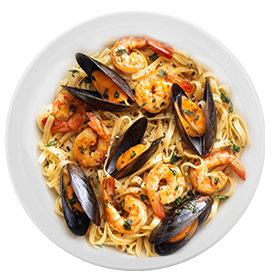 Sauce tomate, fruits de mer, ail, persil + Servie avec parmesan.
