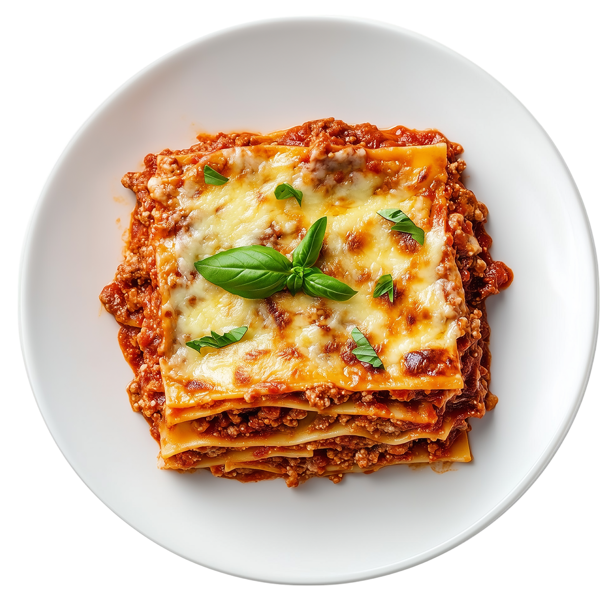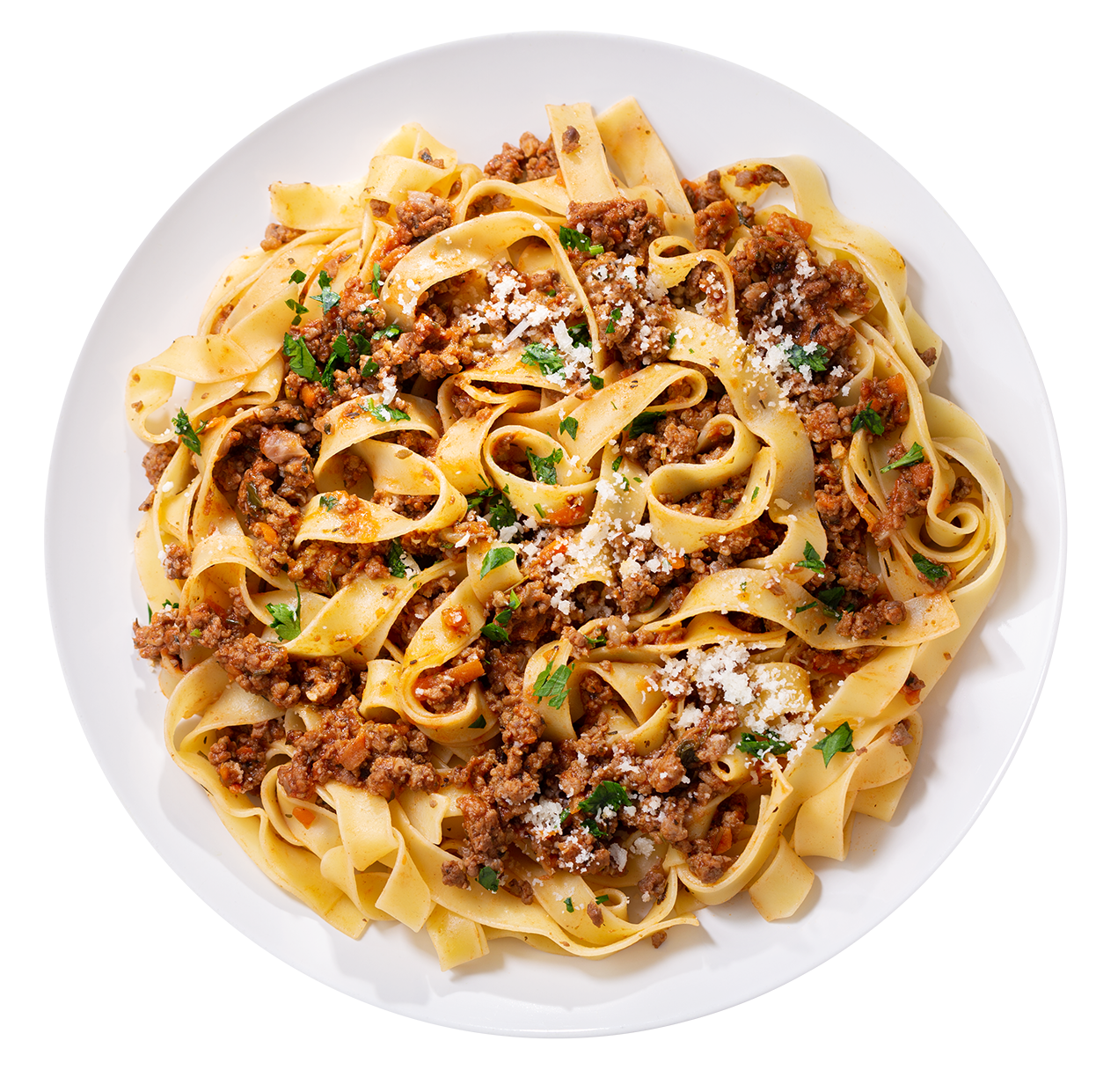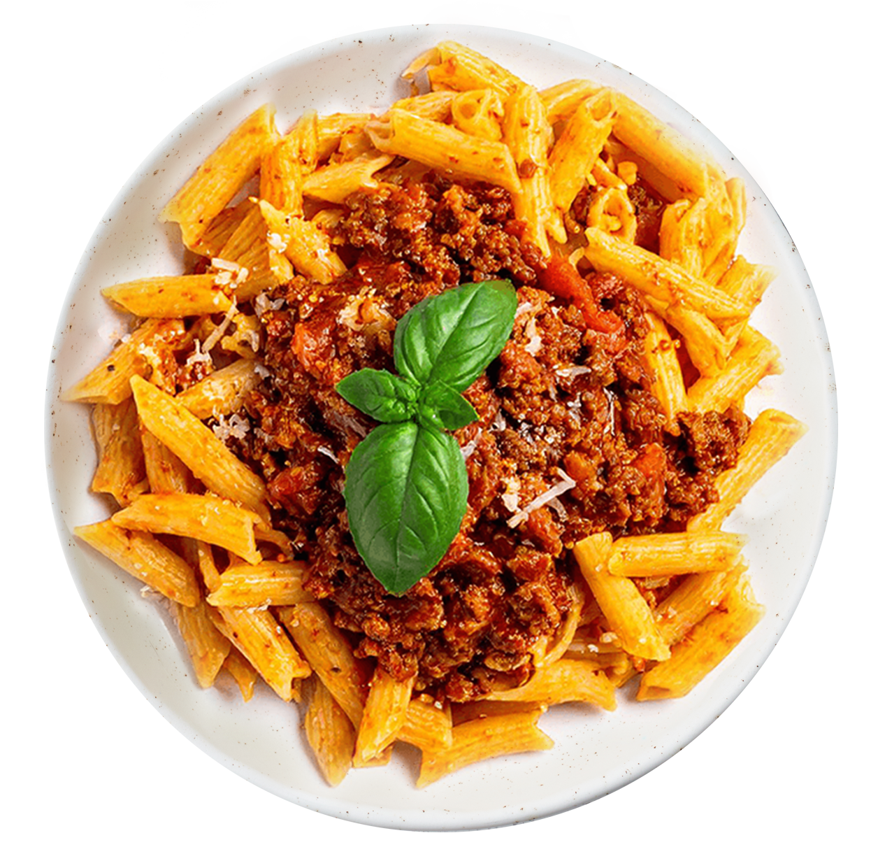 Sauce tomate, viande hachée cuisinée + Servie avec parmesan.