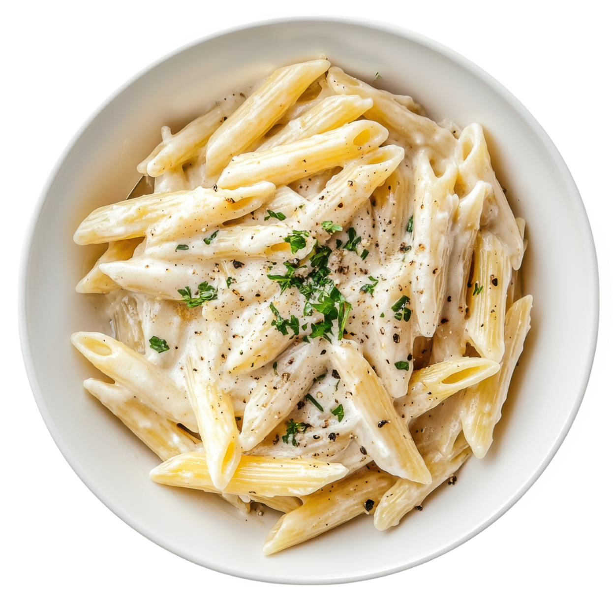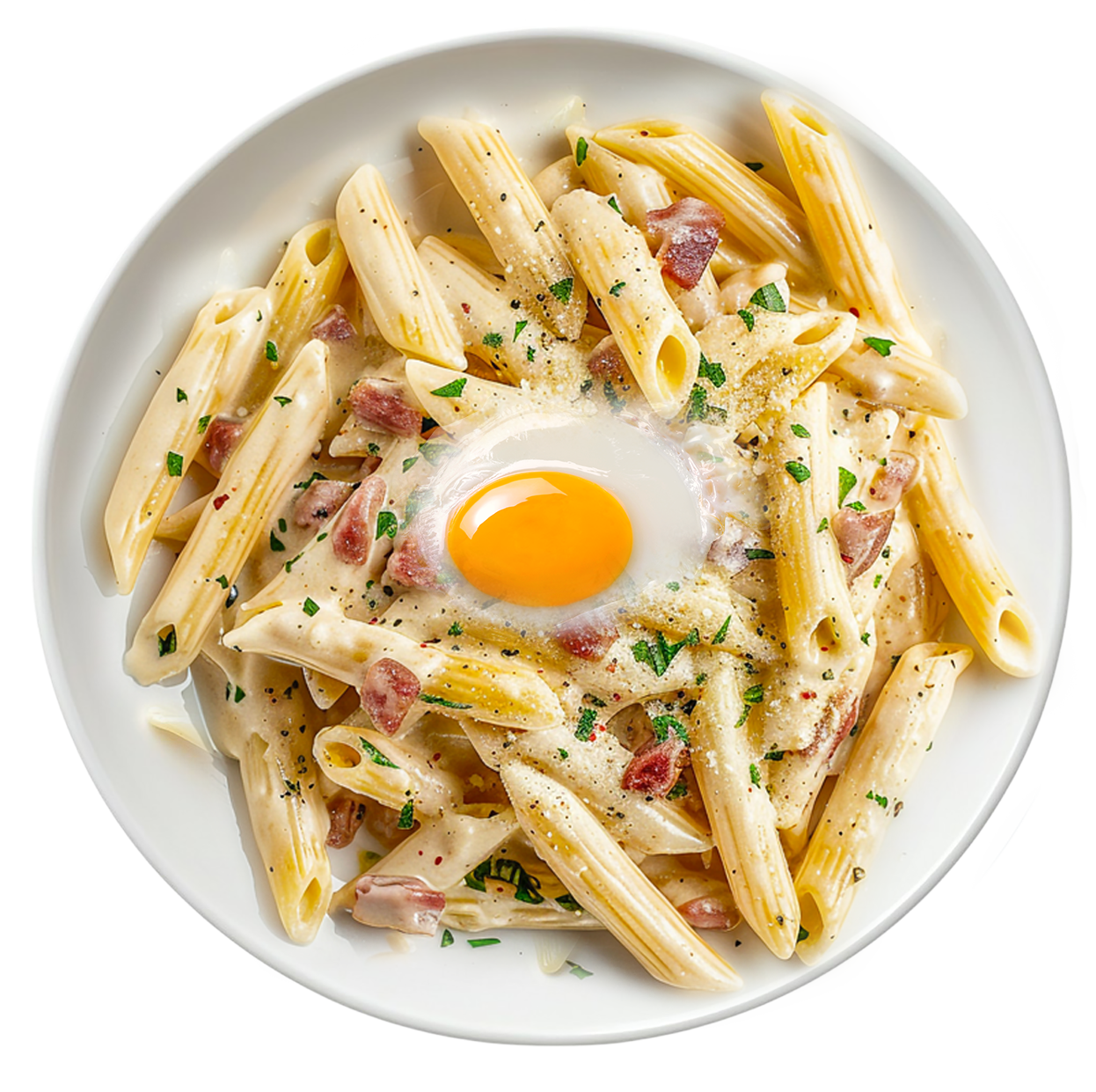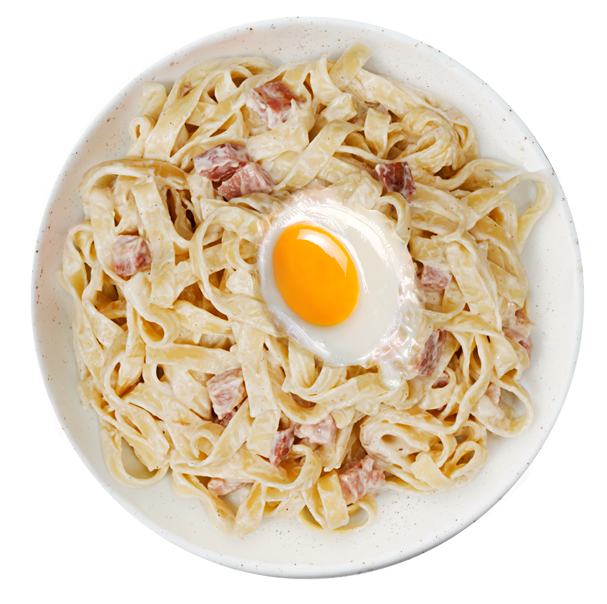 Crème fraîche, lardons, oeuf + Servie avec parmesan.