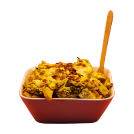 Viande au choix, frites, sauce fromagère, crudités, mozzarella.