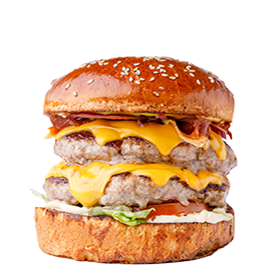 3 Steaks de boeuf smashés, cheddar, salade, oignons rouges, sauces au choix.