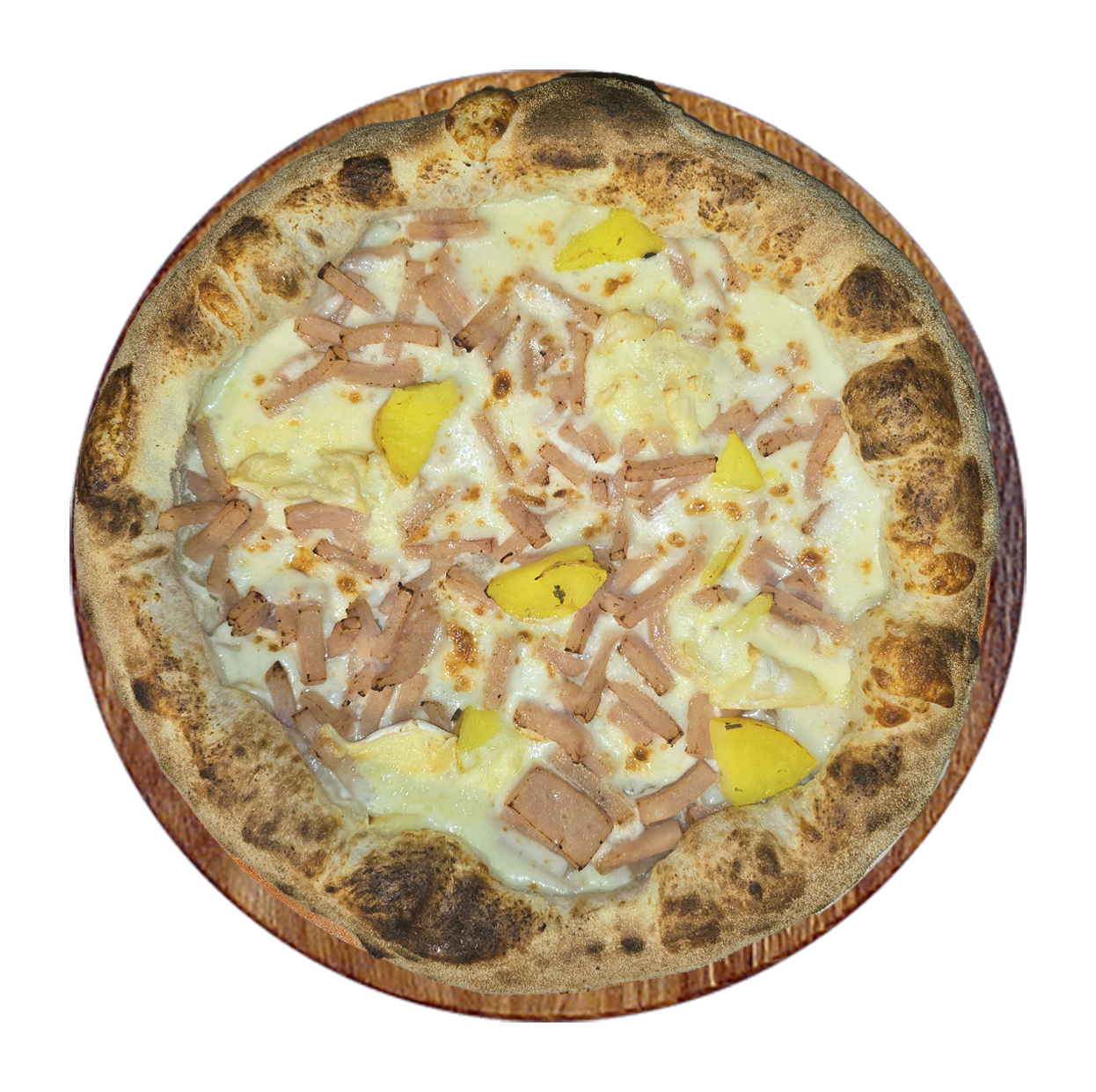 Crème fraiche, tartiflette, lardons fumés, oignons caramélisés, pommes de terre, mozzarella.