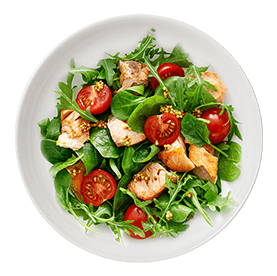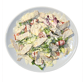 Pain au choix Mélange de salade de saison, tomates cerises, émincé de poulet, crème césar, parmesan.