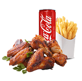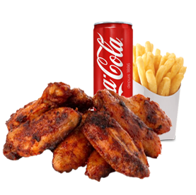 8 Hot wings + 1 Portions de frites + 1 Boisson 33cl au choix.