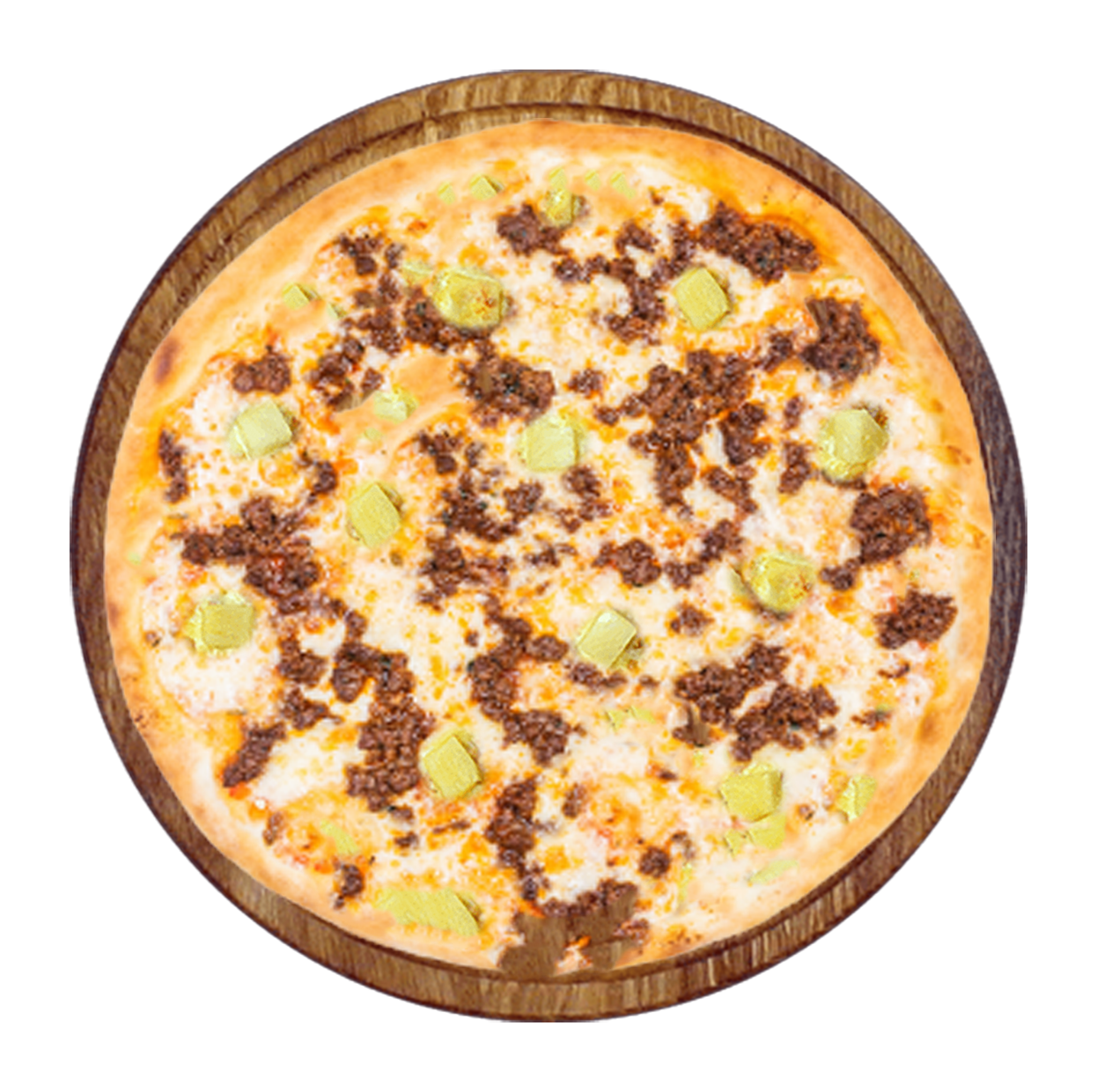 Crème fraîche, mozzarella, boursin, viande hachée, oignons.