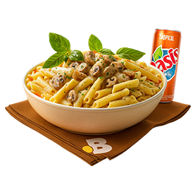 Pâtes, escalope de poulet, champignons, crème fraîche.