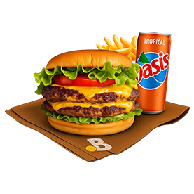 Double smashed beef, cheddar, salade, tomates, oignons, avocat, cornichons, sauce maison.