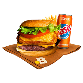 Smashed beef, cheddar, bacon, salade, tomates, oignons, cornichons, sauce maison.
