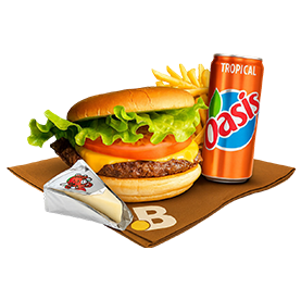 Smashed beef, cheddar, salade, tomates, oignons, cornichons, sauce maison.