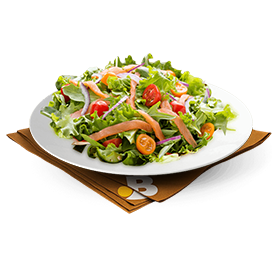 Salade verte, tomates, poulet, maïs, oeuf Servie avec pain et boisson 33cl au choix.