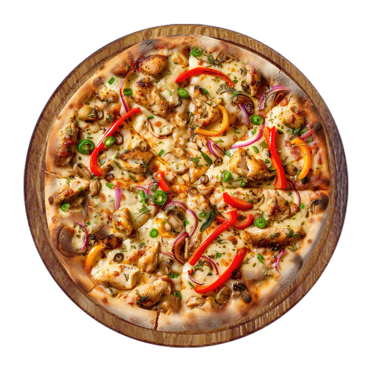 Sauce algérienne, fromage, viande hachée, poulet, poivrons, oignons.