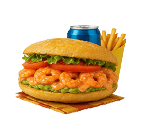 Crevettes, salade, tomates, guacamole, sauce chien, sauce cocktail.