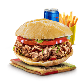 Poulet boucané, banane plantain, Emmental, salade, tomates, oignons caramélisés, sauce chien, sauce brésil.