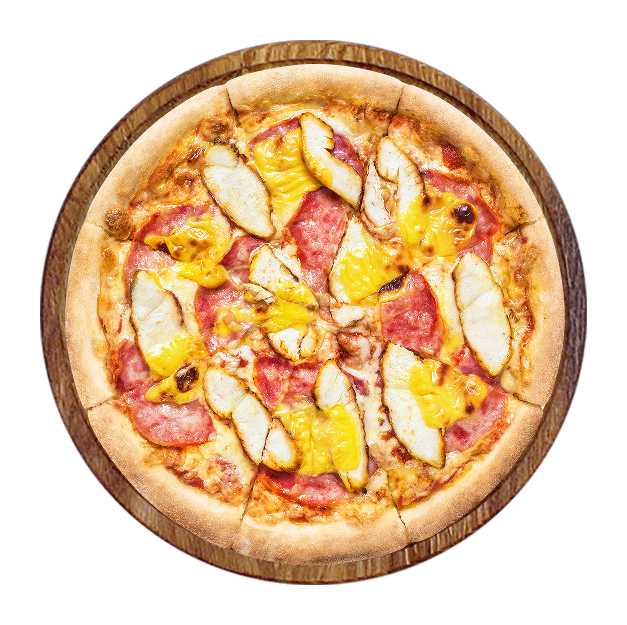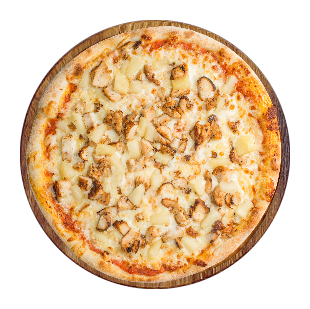 Crème fraîche, fromage, sauce curry, poulet, tomates fraîches, poivrons.