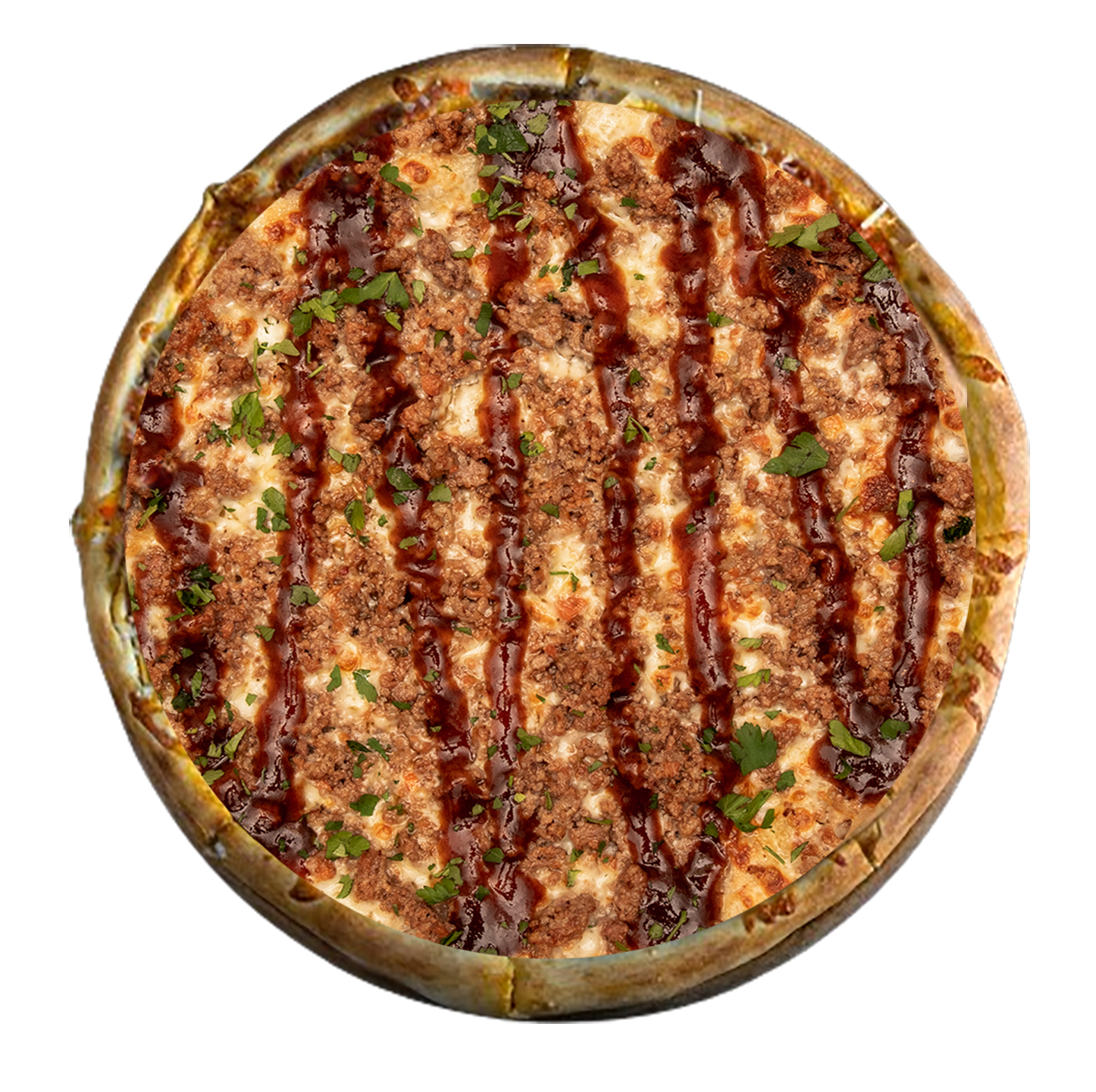 Sauce barbecue, fromage, viande hachée, oignons, poivrons.