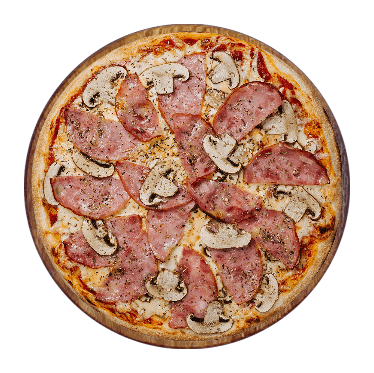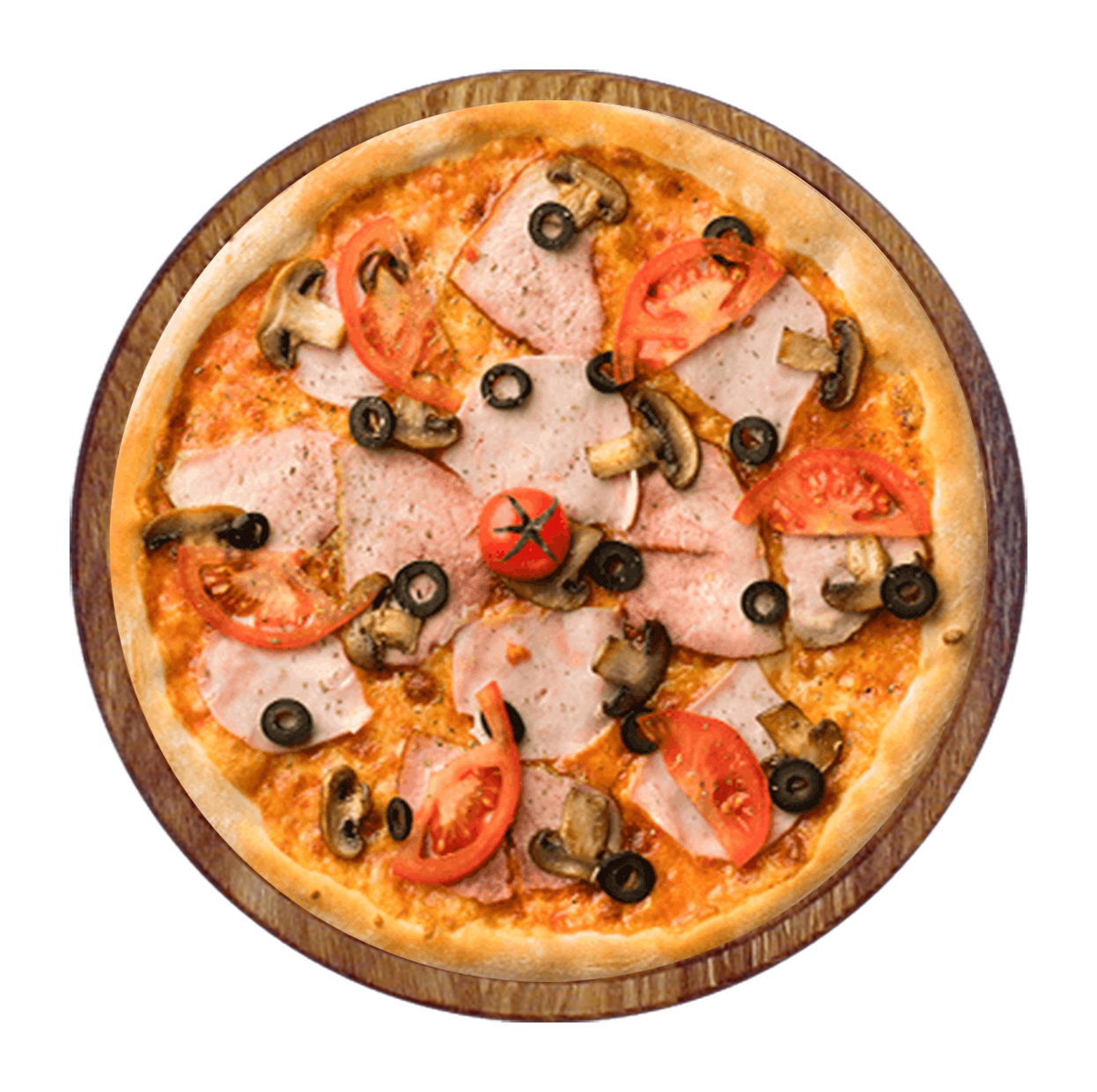 Tomate, fromage, jambon, champignons, olives, origan, tomates cerises.