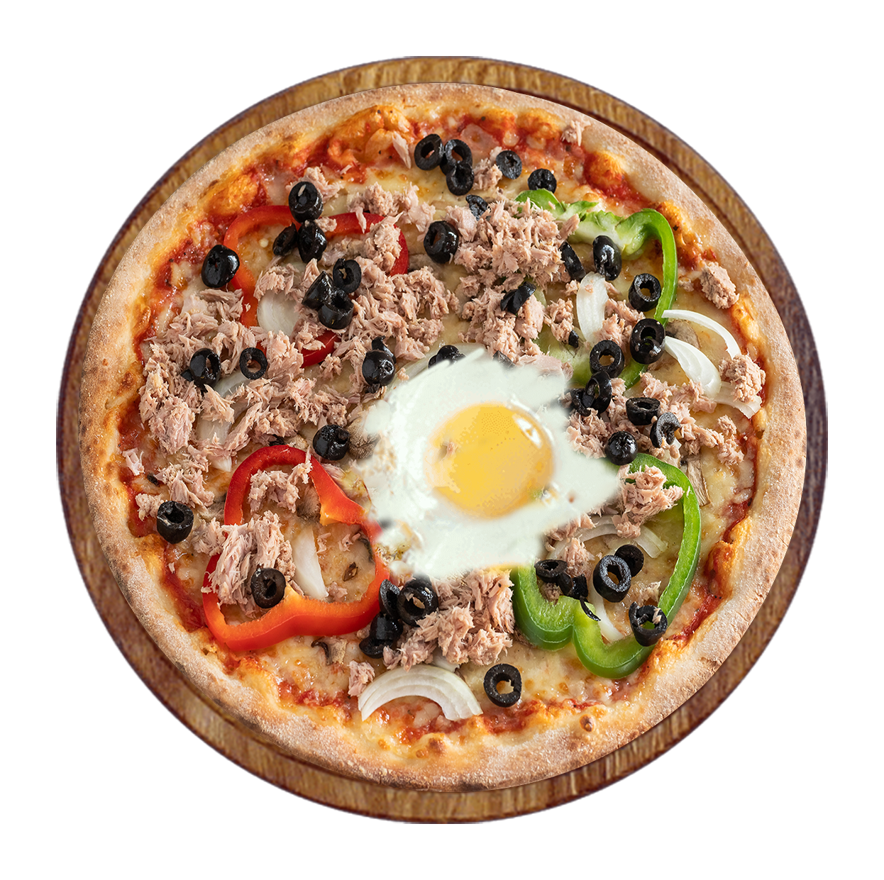 Tomate, fromage, merguez, champignons, oeuf, origan.