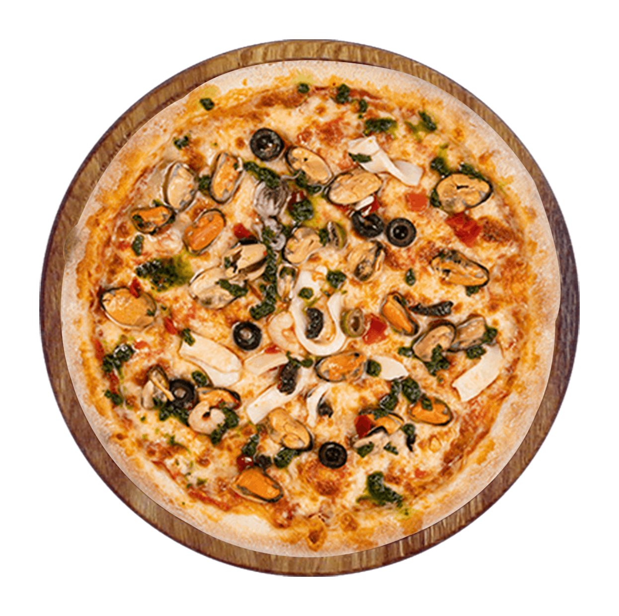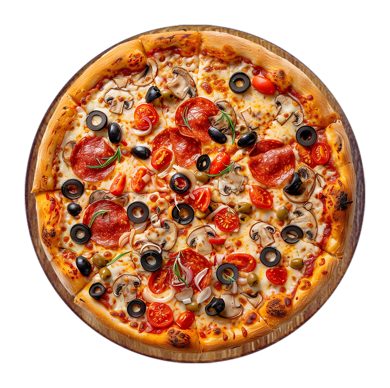 Tomate, fromage, merguez, pepperoni, olives, poivrons.