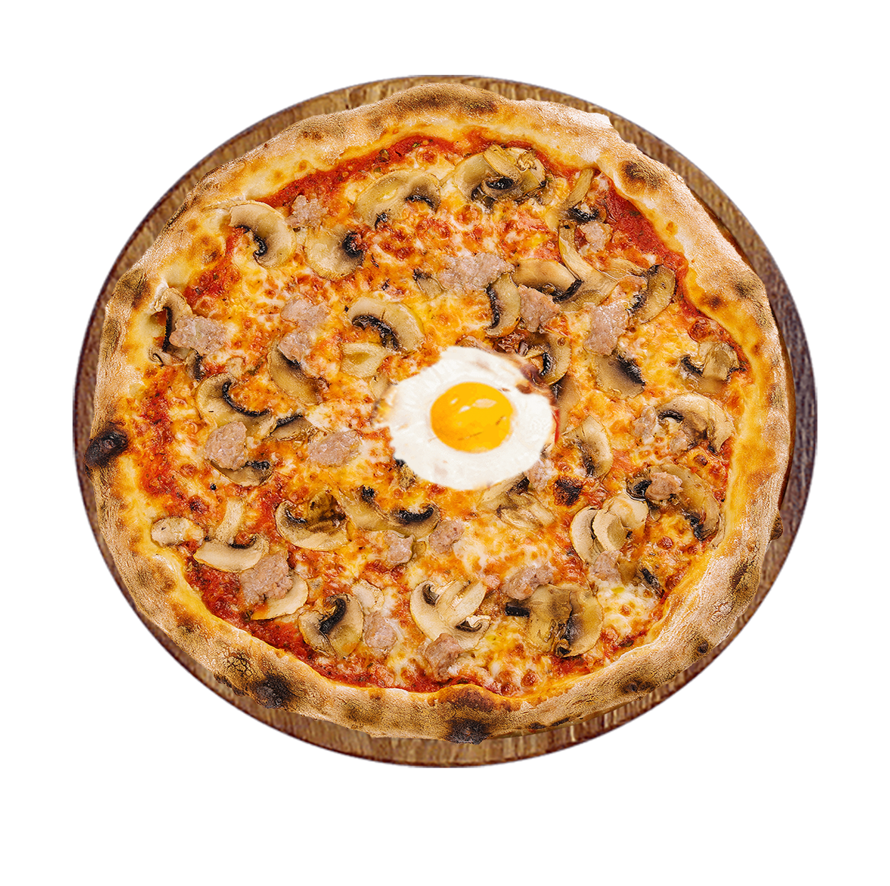 Tomate, fromage, viande hachée, champignons, oeuf.