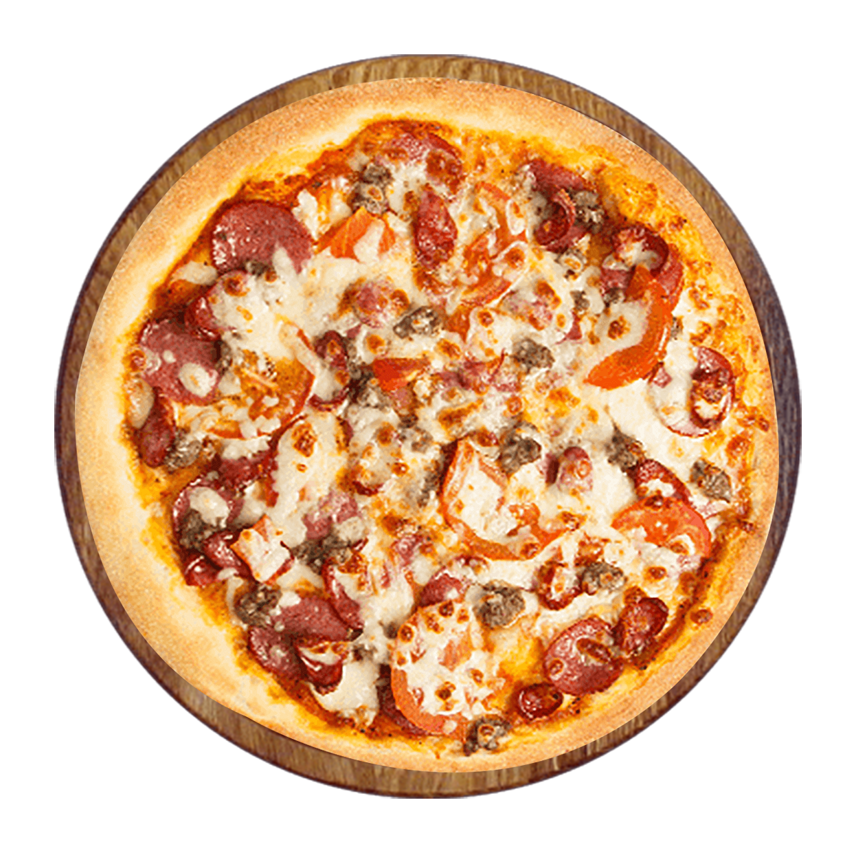 Tomate, fromage, viande hachée, merguez, jambon, poivrons.