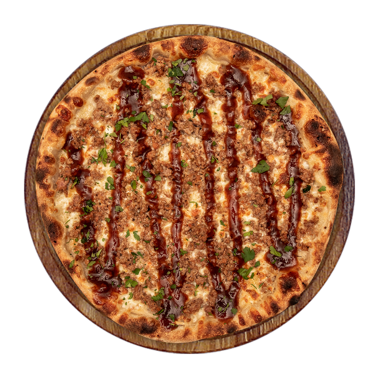 Crème fraîche, viande hachée, merguez, poulet, sauce barbecue.